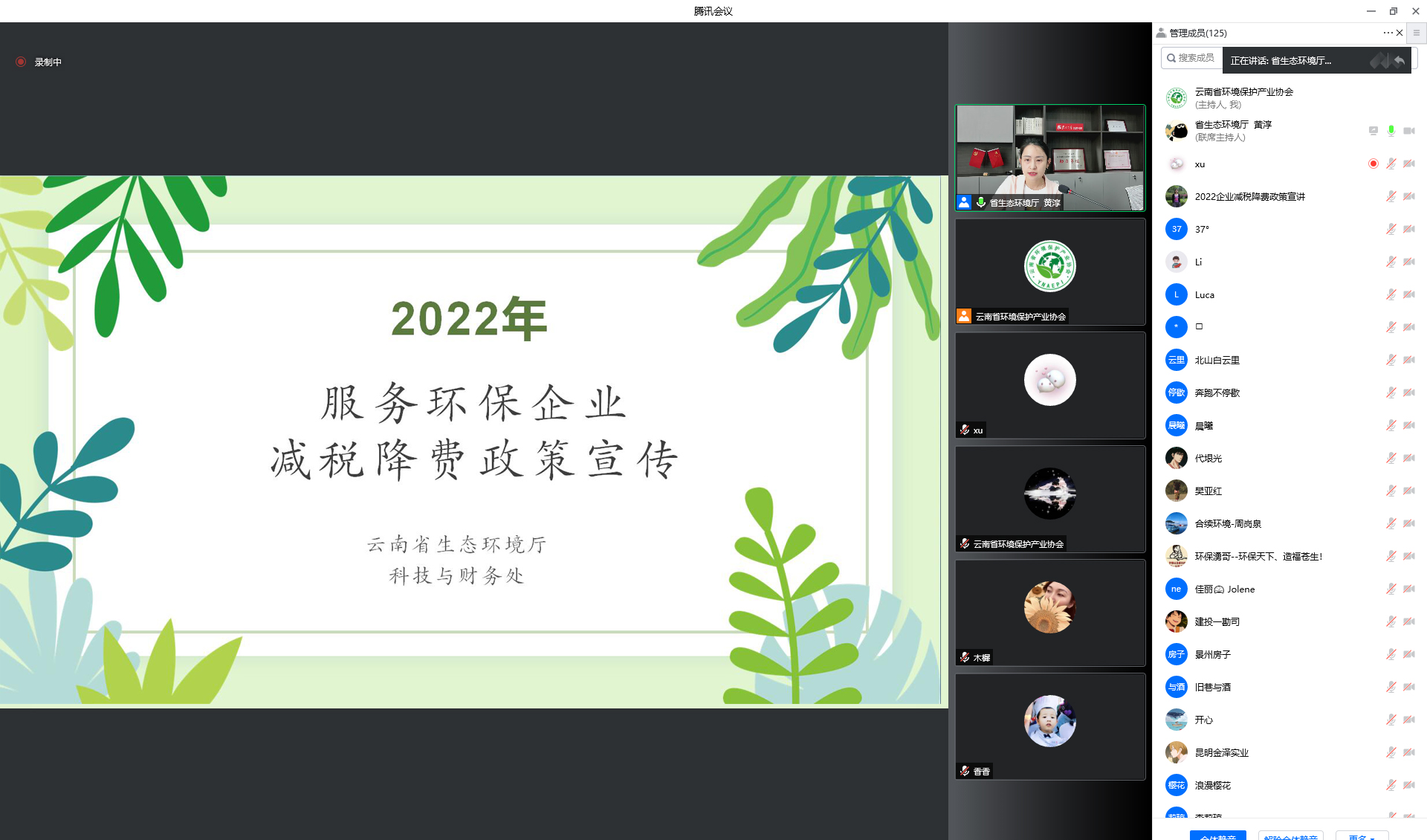 為深入貫徹黨中央國務(wù)院穩(wěn)住宏觀經(jīng)濟(jì)大盤的系列部署,積極助力企業(yè)紓困,服務(wù)環(huán)保企業(yè),云南省生態(tài)環(huán)境廳聯(lián)合云南省環(huán)境保護(hù)產(chǎn)業(yè)協(xié)會于2022年6月10日上午開展了面向全省環(huán)保企業(yè)的減稅降費(fèi)政策宣講活動,云南省生態(tài)環(huán)境廳科技與財(cái)務(wù)處一級主任科員黃淳介紹了2022年新出臺的國家及云南省的相關(guān)減稅降費(fèi)政策。