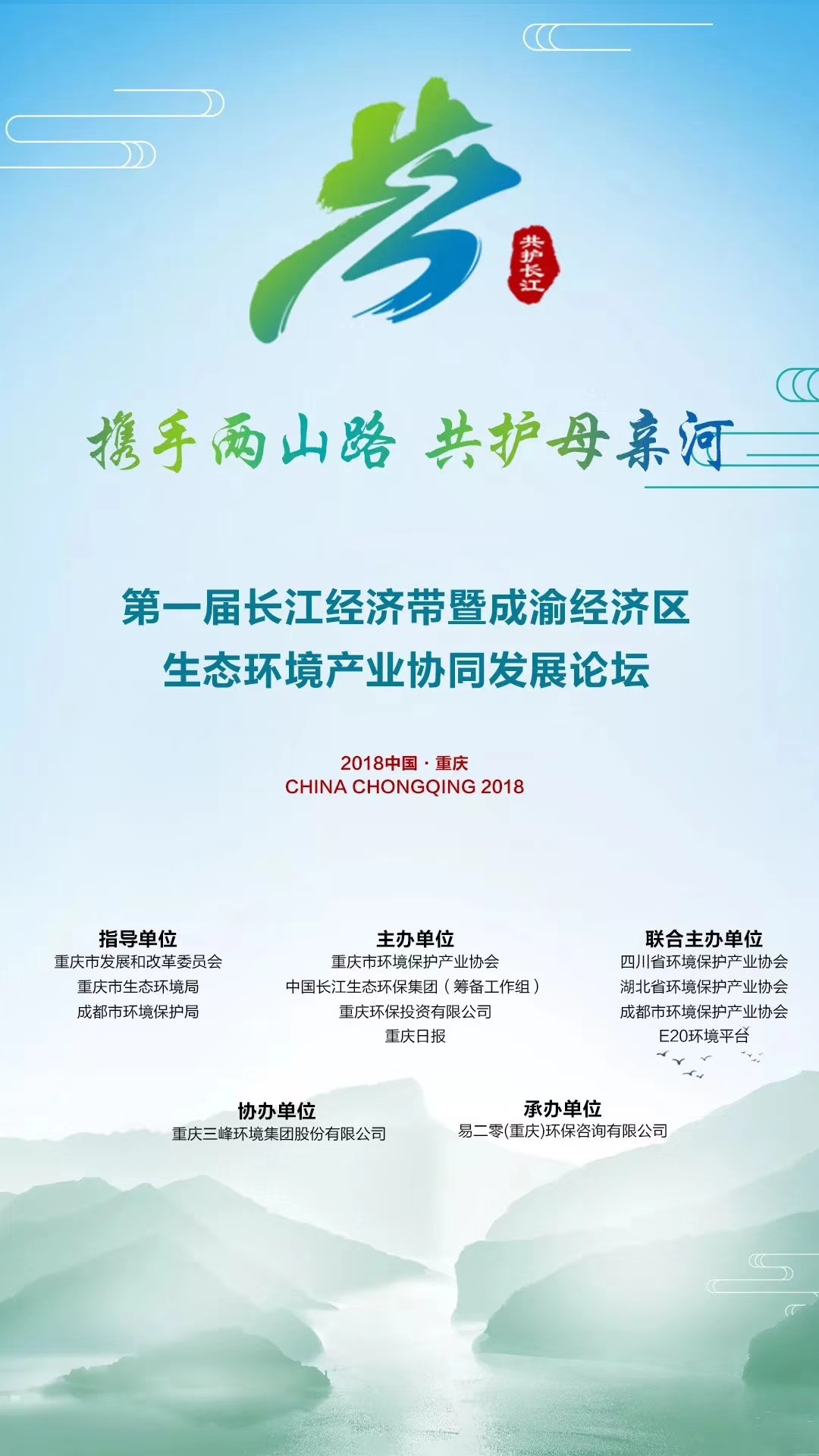 本次論壇是長江經(jīng)濟(jì)帶生態(tài)環(huán)境產(chǎn)業(yè)業(yè)界首次高峰論壇,主題為“攜手兩山路、共護(hù)母親河”,由重慶市環(huán)境保護(hù)產(chǎn)業(yè)協(xié)會(huì)、中國長江生態(tài)環(huán)保集團(tuán)(籌建辦)、重慶環(huán)保投資有限公司與重慶日?qǐng)?bào)共同主辦,四川省環(huán)境保護(hù)產(chǎn)業(yè)協(xié)會(huì)、成都市環(huán)境保護(hù)產(chǎn)業(yè)協(xié)會(huì)、湖北省環(huán)境保護(hù)產(chǎn)業(yè)協(xié)會(huì)、E20環(huán)境平臺(tái)聯(lián)合主辦。