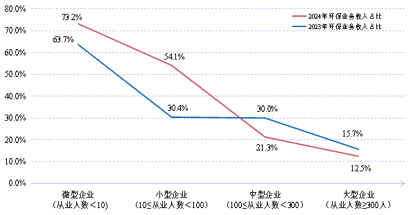 從企業(yè)規(guī)模看,大、中、小、微型企業(yè)年?duì)I業(yè)收入占調(diào)查企業(yè)總營(yíng)收的比例分別為86.2%、9.3%、4.5%0.1%,大型企業(yè)數(shù)量最少,但對(duì)環(huán)??偁I(yíng)收的貢獻(xiàn)最大,小微企業(yè)數(shù)量較多,但產(chǎn)出貢獻(xiàn)。根據(jù)統(tǒng)計(jì)結(jié)果,統(tǒng)計(jì)范圍內(nèi)企業(yè)營(yíng)業(yè)收入總額約563.96億元,其中環(huán)保業(yè)務(wù)營(yíng)業(yè)收入約85.80億元,在總營(yíng)業(yè)收入中占比15.2%。從企業(yè)類型看,2024大、中、小、微型企業(yè)環(huán)保業(yè)務(wù)收入占對(duì)應(yīng)類別年?duì)I收總額比重分別為12.5%21.3%、54.1%74.7%,2023年相同指標(biāo)分別為15.7%、30.0%30.4%63.7%。由此可見,企業(yè)環(huán)保業(yè)務(wù)營(yíng)業(yè)收入占比情況與企業(yè)規(guī)模大致成反比,企業(yè)規(guī)模越大,其環(huán)保業(yè)務(wù)營(yíng)收占比越低,顯示出大型企業(yè)呈多元化發(fā)展,小微企業(yè)呈專業(yè)化發(fā)展的現(xiàn)象,且這種差異化發(fā)展有加大的趨勢(shì)
