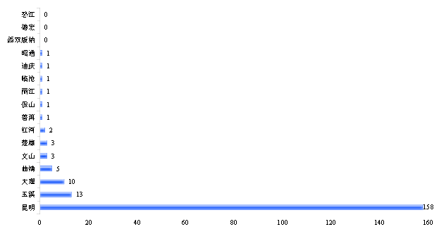 統(tǒng)計(jì)范圍內(nèi)的200家環(huán)保企業(yè)地域分布高度集中,滇中城市群聚集了調(diào)查范圍內(nèi)90.5%的企業(yè),共計(jì)181家,主要分布在昆明、玉溪、楚雄、曲靖四座城市,其中昆明環(huán)保企業(yè)158家,占統(tǒng)計(jì)企業(yè)總數(shù)的79.0%